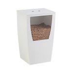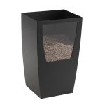 Pelletlager aus Stahl mit einem Fassungsvermögen von 42 kg, bei dem der Pelletstand durch ein Glasfenster sichtbar ist.